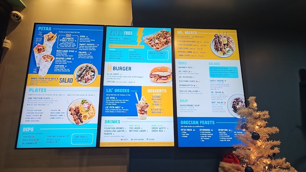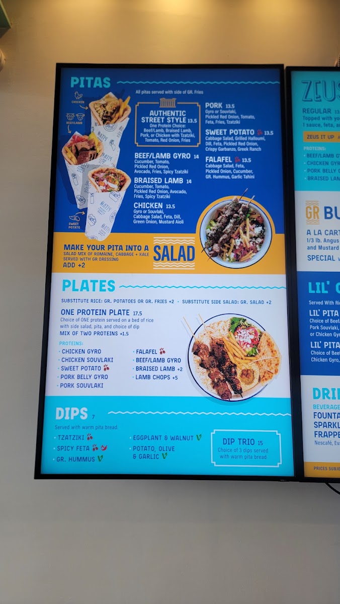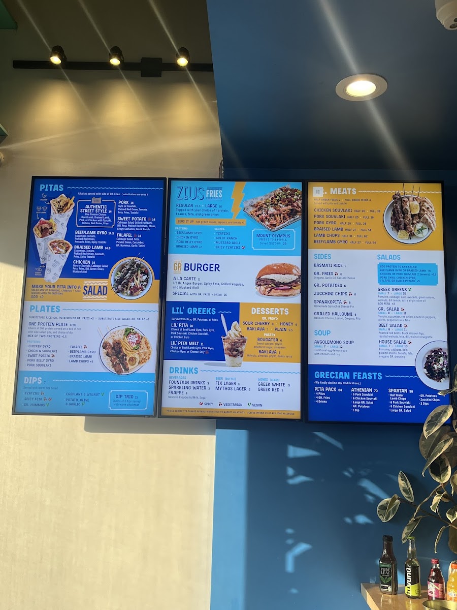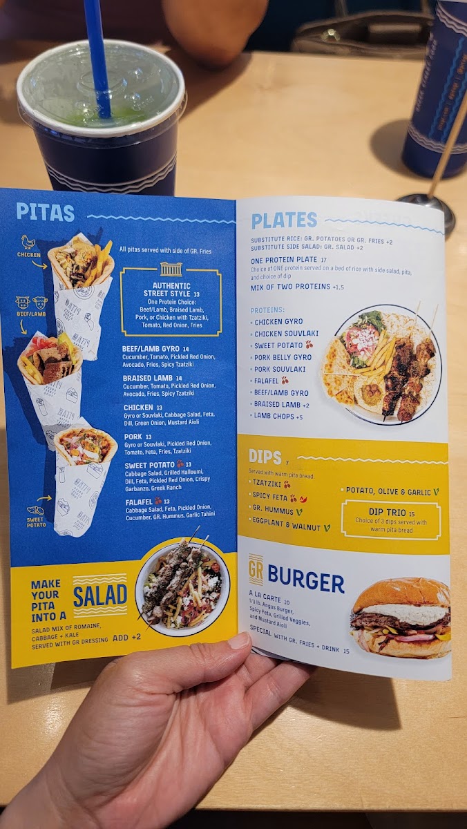 Highlights include crispy zucchini chips, savory pork souvlaki, and hearty lamb rotisserie pitas, along with fresh salads and classic sides like souvla potatoes. For a sweet finish, options like bougatsa baklava or frozen yogurt provide a gentle contrast to the savory offerings. The menu also features build-your-own pita options and sharing platters, making it easy to customize meals whether you come alone or with a group.