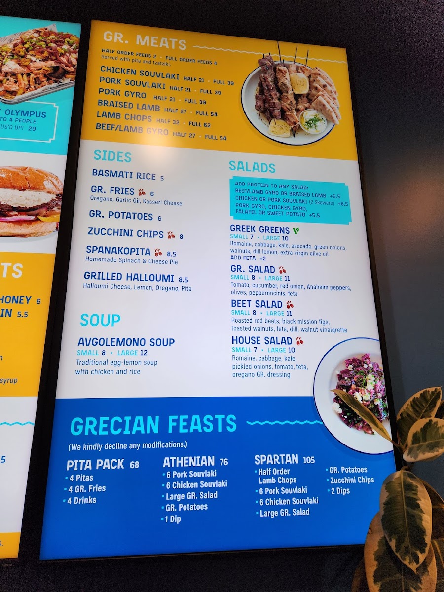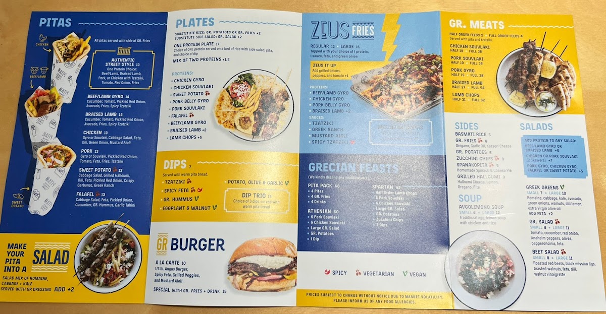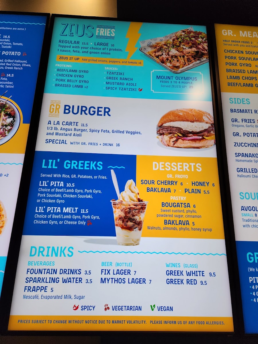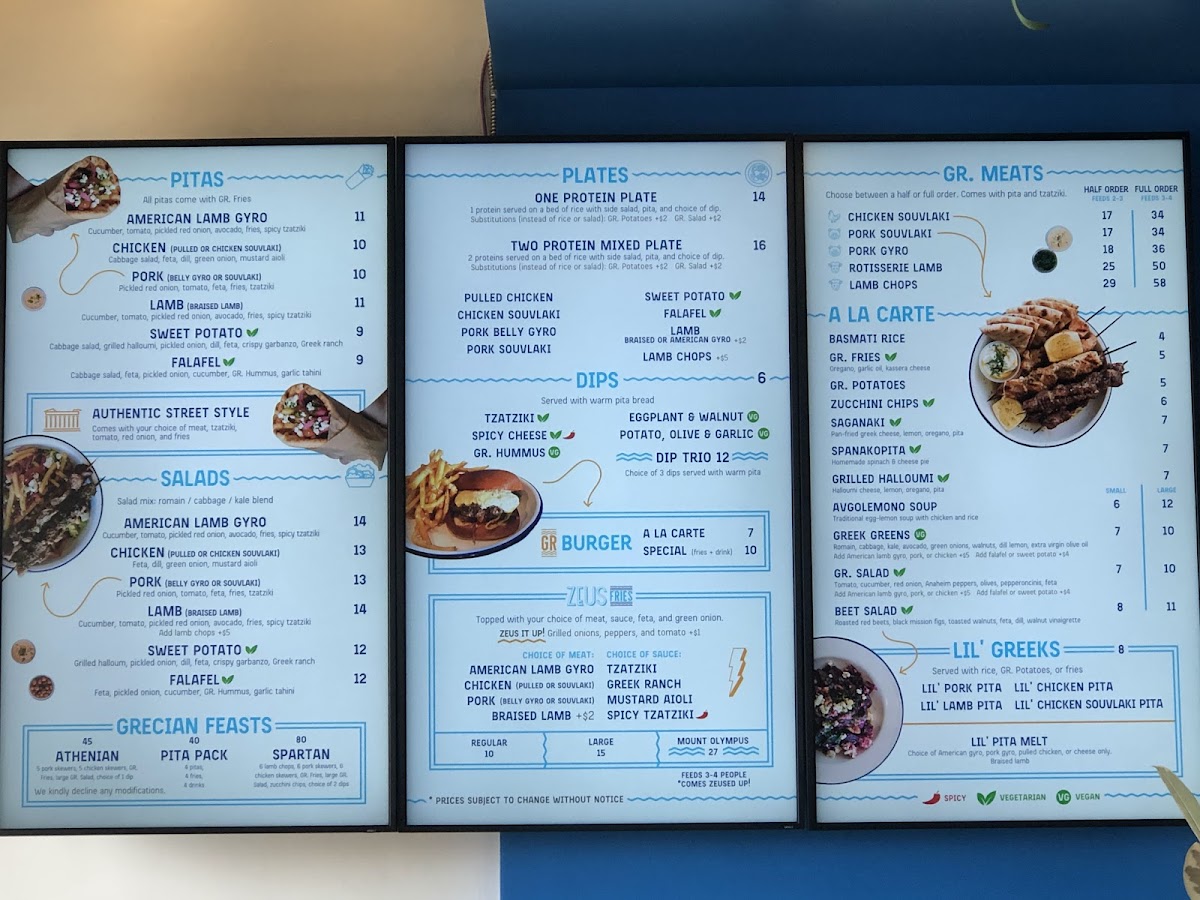 Highlights include crispy zucchini chips, savory pork souvlaki, and hearty lamb rotisserie pitas, along with fresh salads and classic sides like souvla potatoes. For a sweet finish, options like bougatsa baklava or frozen yogurt provide a gentle contrast to the savory offerings. The menu also features build-your-own pita options and sharing platters, making it easy to customize meals whether you come alone or with a group.